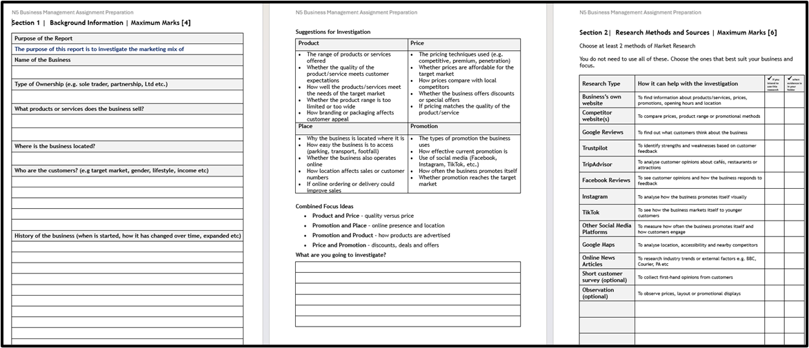 I used this prep sheet with my N5 Business class to get them started with their business assignments. There’s no denying that this resource is a bit heavy on paper but I was trying to find a way for pupils to research their business properly, think about what area of business they wanted to focus on and the market research they had to do…. and get them to start writing things down!
